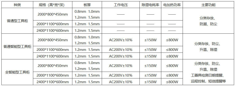 普通智能工具柜里面有一臺除濕機,柜體外面有一個數字顯示器顯示柜內溫濕度,可以通過顯示器上按鍵調節柜內溫濕度大小,結構簡單,操作方便,具體操作詳見智能工具柜說明書