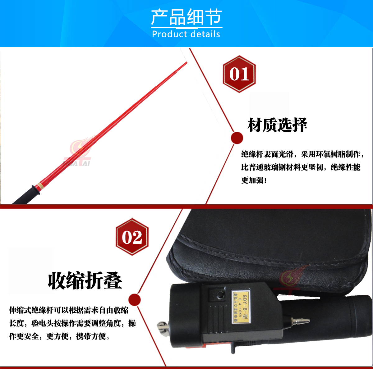 石家莊華泰電力工具有限公司公司生產GDY-II型聲光驗電器,分為0.1kV至500kV七個電壓等級產品,供用戶按實際運行電壓等級選擇訂貨。驗電時它即發出聲和光雙重報警信號,以提示工作人員被檢線路或設備帶電。