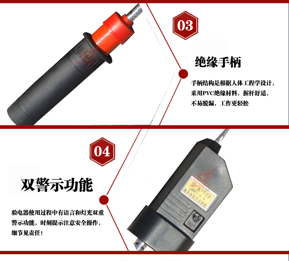 (二)、驗電器使用前必須進行自檢:方法是用手指按動自檢按鈕,指示燈有間斷閃光,同時發出間斷報警聲,說明該儀器正常。