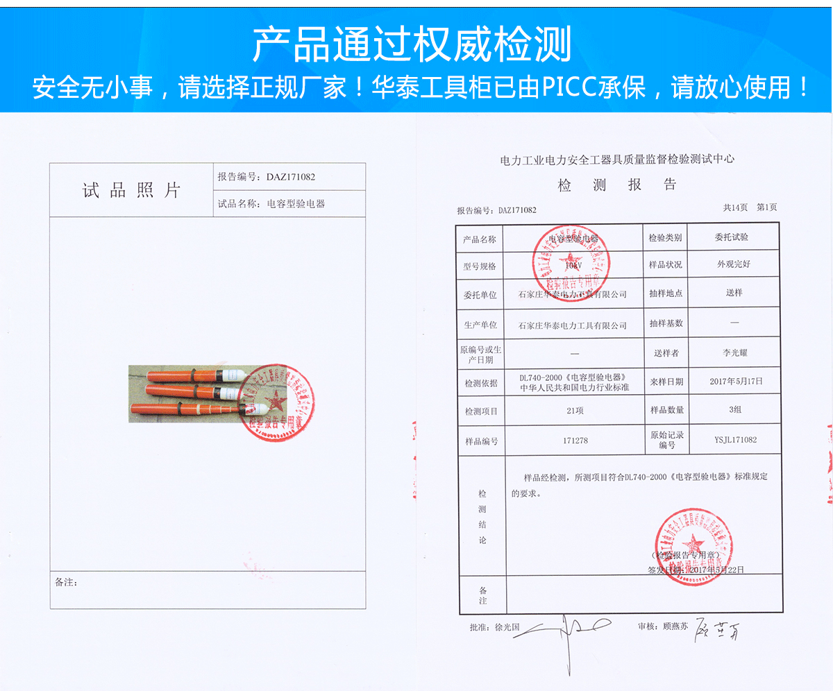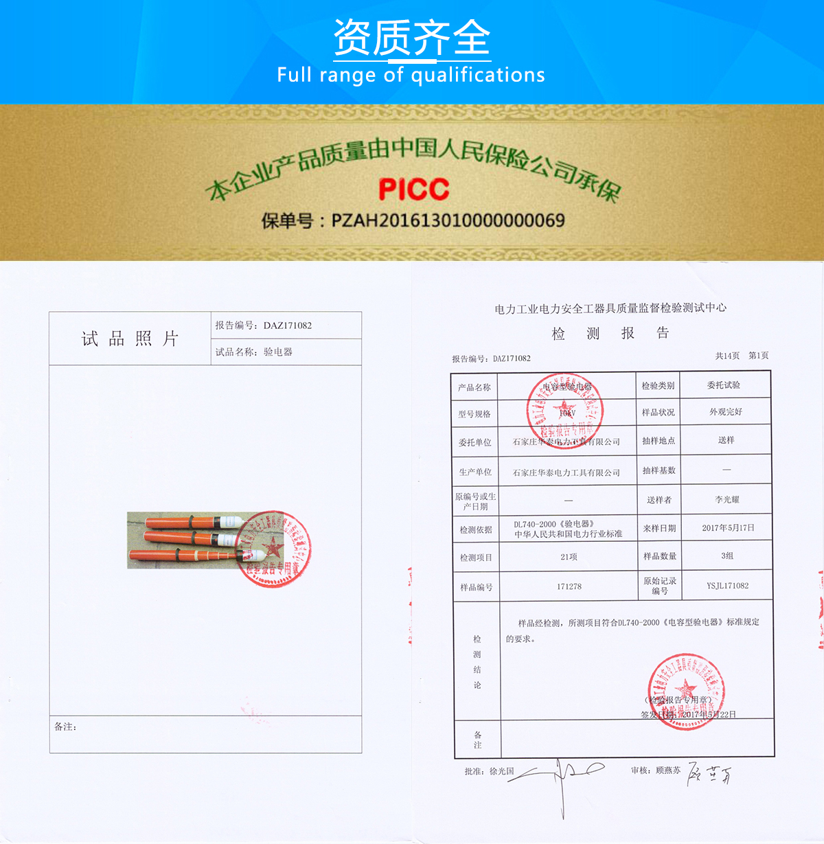 該驗電器在電力工業電力安全工器具檢測中心通過型式試驗,主要技術指標符合DL740-2000電力行業標準及國際IEC技術標準。產品通過省級鑒定并經電力工業審查,同意在全國推廣使用。