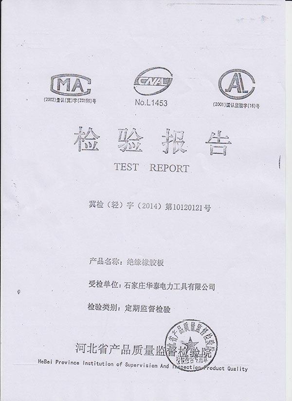 我公司的絕緣膠墊嚴格按照國家標準(HG2949-1999《電絕緣橡膠板》)生產標準來生產,工頻耐壓達到國家上成膠墊標準要求,有國家第三方檢測報告。