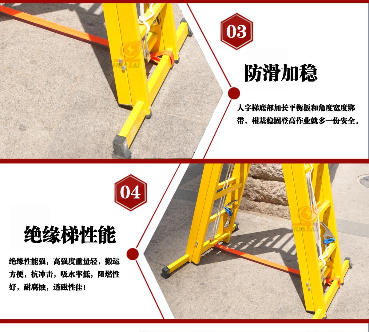絕緣梯采不飽和樹脂和玻璃纖維聚合拉擠制造工藝,材質選用環氧樹脂結合銷棒技術,軸類鋼制件表面有防護鍍層;絕緣層壓類材料制件加工表面用了絕緣漆進行處理。梯撐、梯腳防滑設計不易疲勞,梯各部件外形無尖銳棱角,安全程度高,絕緣性能強;吸水力低,耐腐蝕。