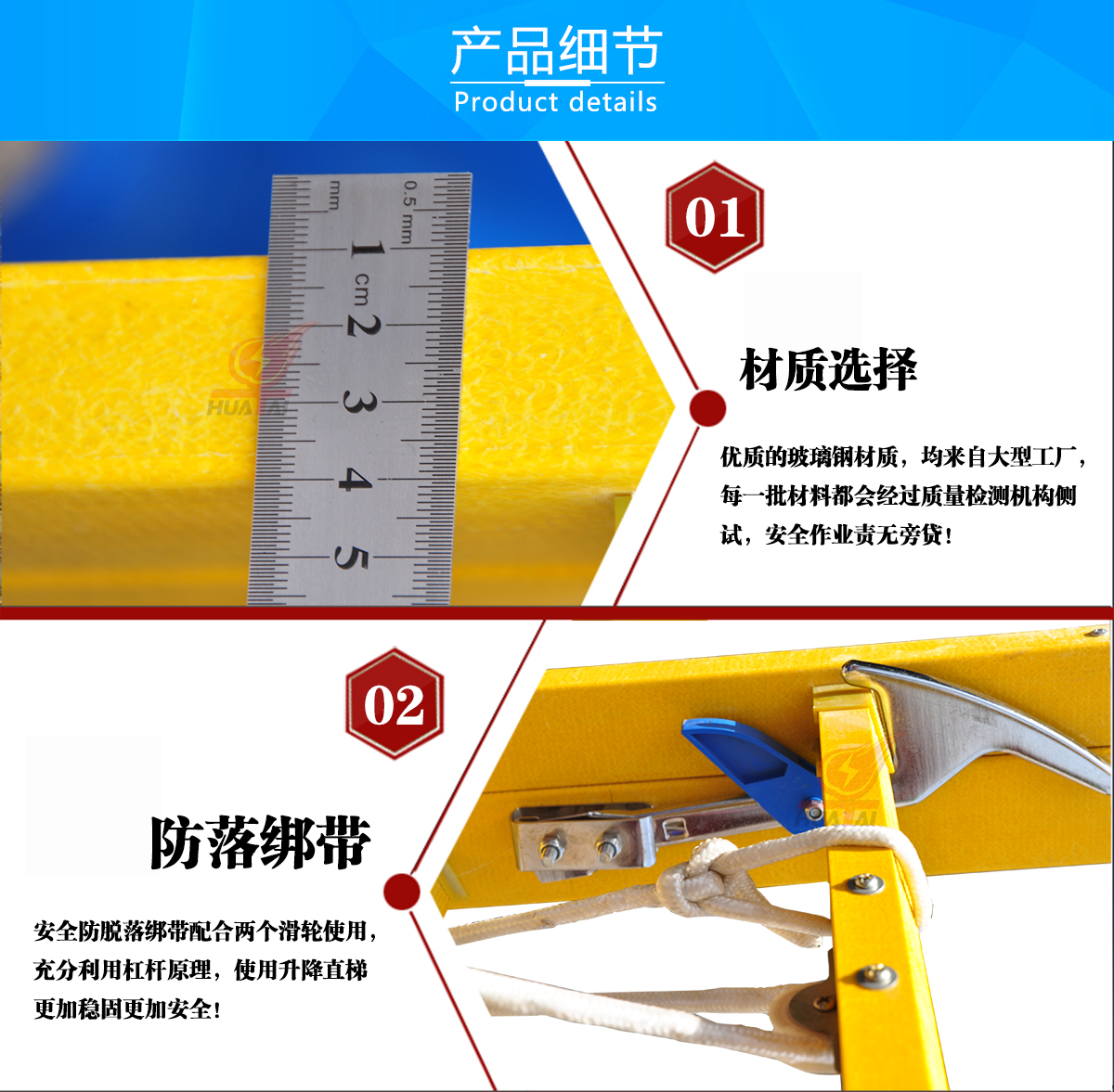 4、 如果絕緣梯使用高度超過5米,請務必在梯子中上部設立F8以上拉線。