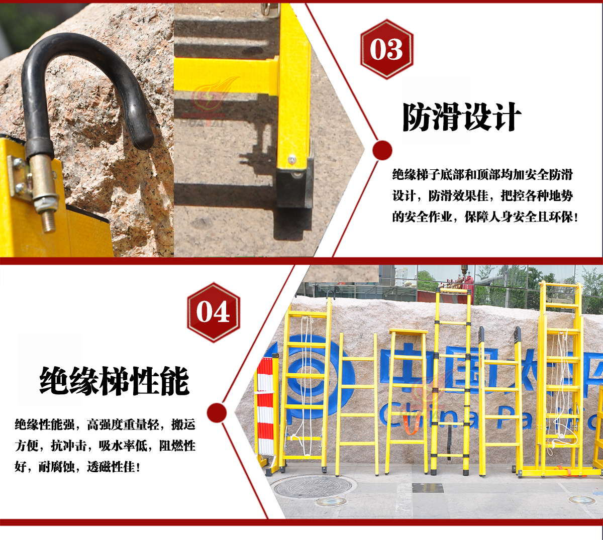 3、 檢查所有絕緣梯梯腳是否與地面接觸良好,以防打滑。