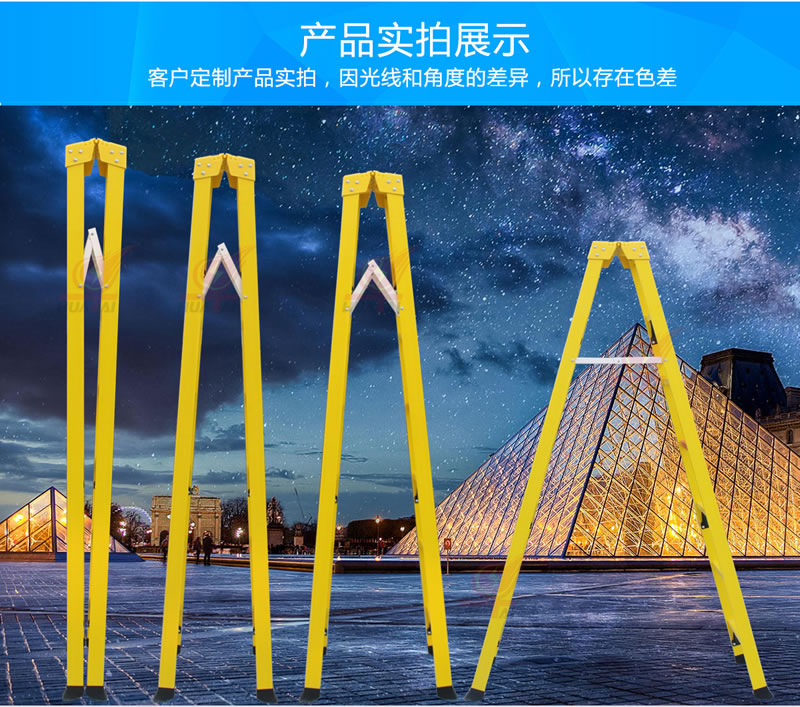 升級版玻璃鋼絕緣人字梯名稱由來:用于在平面上方空間(如屋頂)進行裝修之類工作的一類登高工具,因其使用時,前后的梯桿及地面構成一個等腰三角形,看起來像一個""字,因而把它形象的稱為"人字梯"。