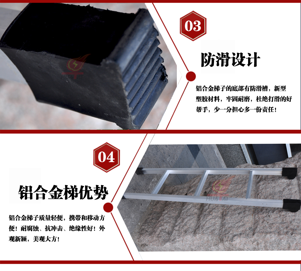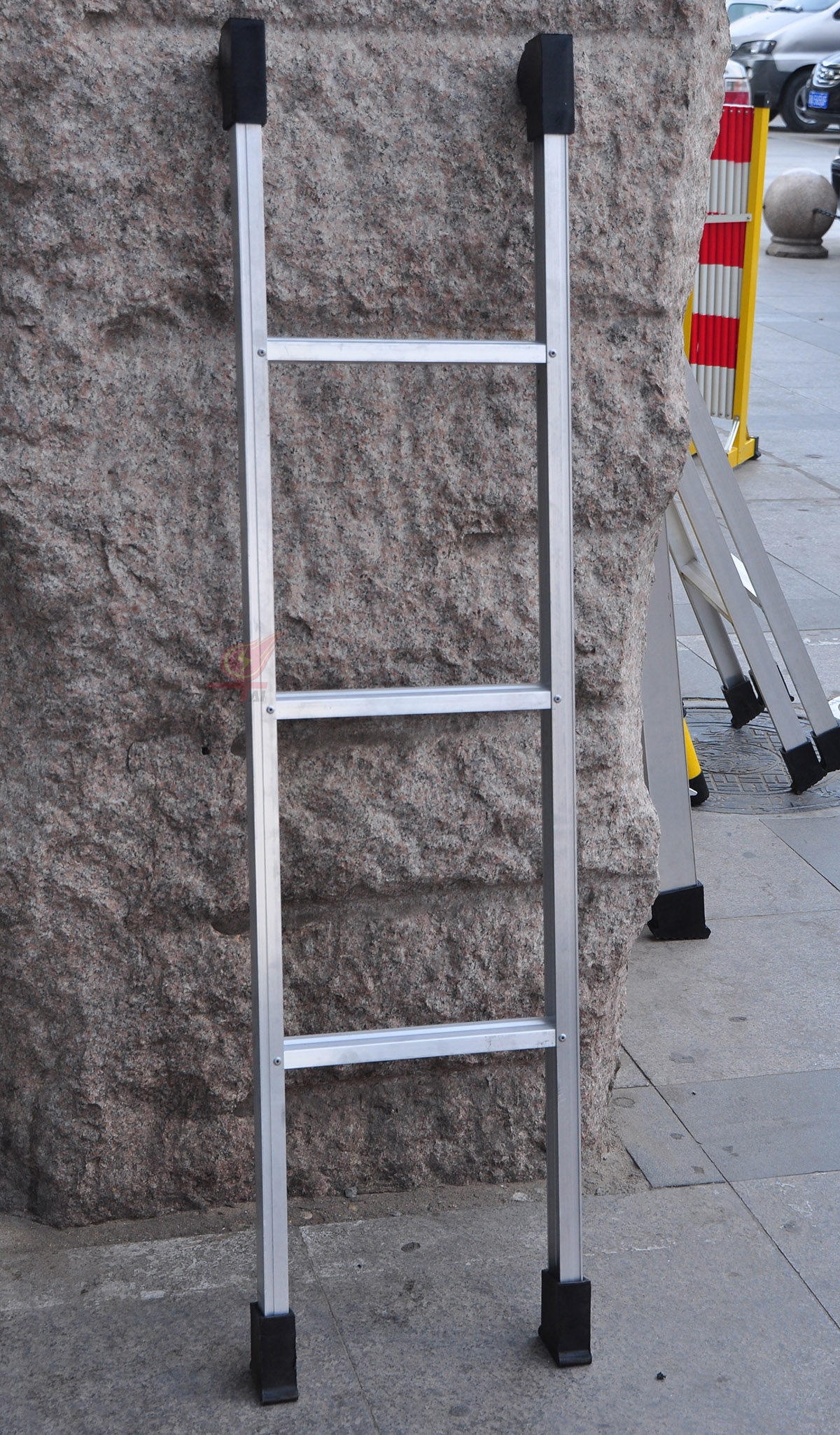 鋁合金單直梯梯撐、梯腳防滑設計不易疲勞,梯各部件外形無尖銳棱角,安全程度高,絕緣性能強