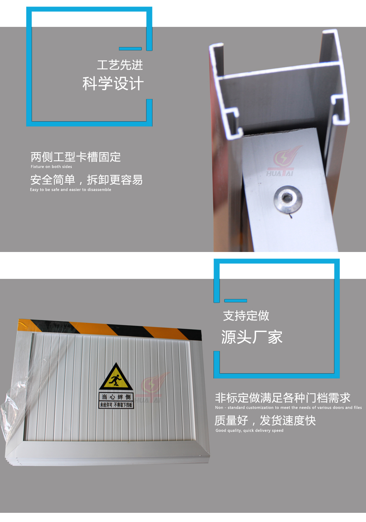新型鋁合金材質擋鼠板替代老式擋鼠板材,實用、結實、耐用、使用時間長。由擋鼠板主板面和卡槽夠成,外觀可見部分為鋁合金定制,且貼有黃黑色的反光警示貼。