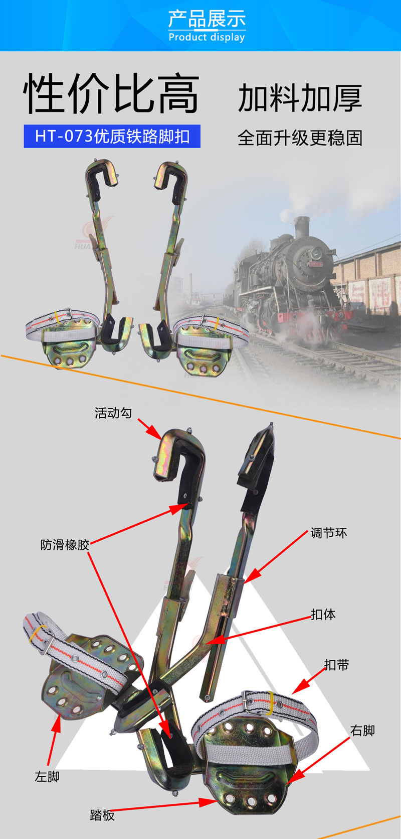 2、使用前應按電桿規格選擇合用的腳扣,并檢查金屬母材及焊縫無任何裂紋和可目測到的變形;皮帶完好,無霉變、裂縫或嚴重變形;小爪連接牢固,活動靈活,橡膠防滑塊(套)完好,無破損。有腐蝕裂紋的禁止使用。