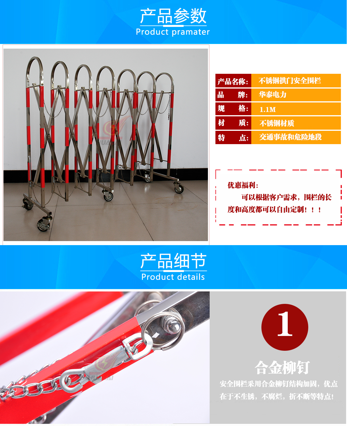| 不銹鋼折疊圍欄(拱門式) | 1.2*2.6m、1.2*3m、1.2*3.5m、1.5*2.5m、1.5*3m、1.5*5m | 套 | |