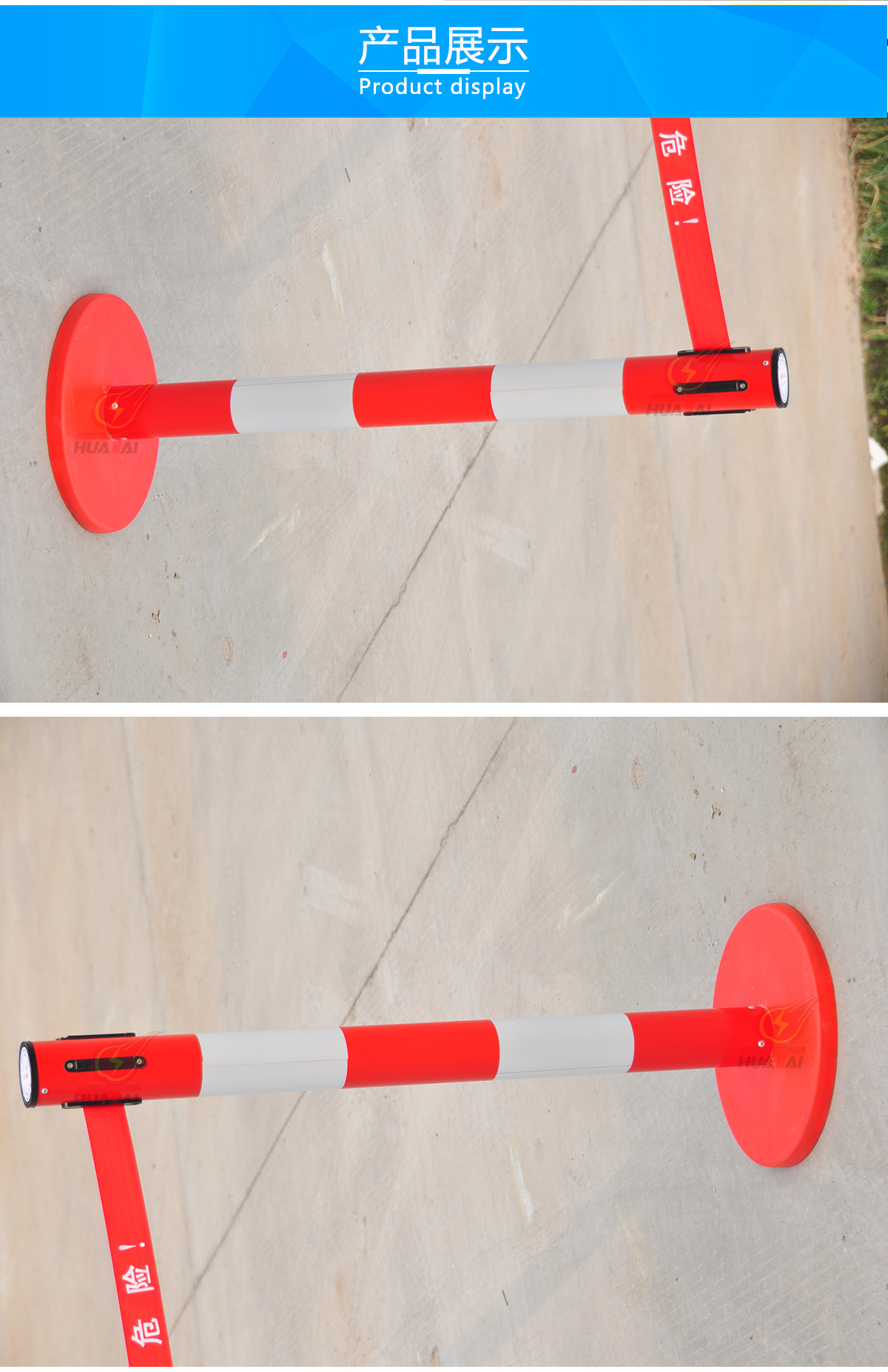 玻璃鋼帶式伸縮圍欄 高度1米,筒體的直徑是76mm,筒的壁為0.8個厚,底盤是 350mm。 帶子最長做到5米,帶寬5cm 。可以雙層也可以單層帶子,兩層帶子的間距30厘米,一般是上紅下黃,紅色帶子上印 黃字(白字),黃色帶子上印紅字。這樣比較醒目。字分熒光字和普通字。 “閃電符號 止步 高壓危險/危險/止步 危險” 等等,可以根據(jù)客戶要求定做。每根立柱上都含有帶子,四個方向都可以掛帶子。熒光式安全警示帶圍欄,產(chǎn)品設(shè)計精美,使用靈活,隨意伸縮,隨意間距,和分割 形狀,無限連接等特點。