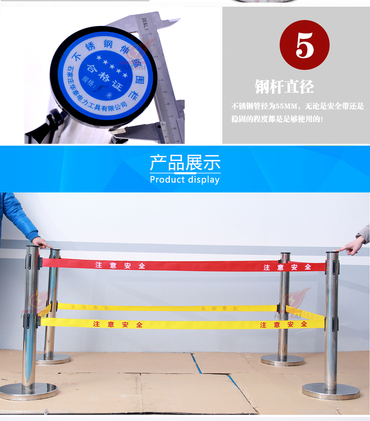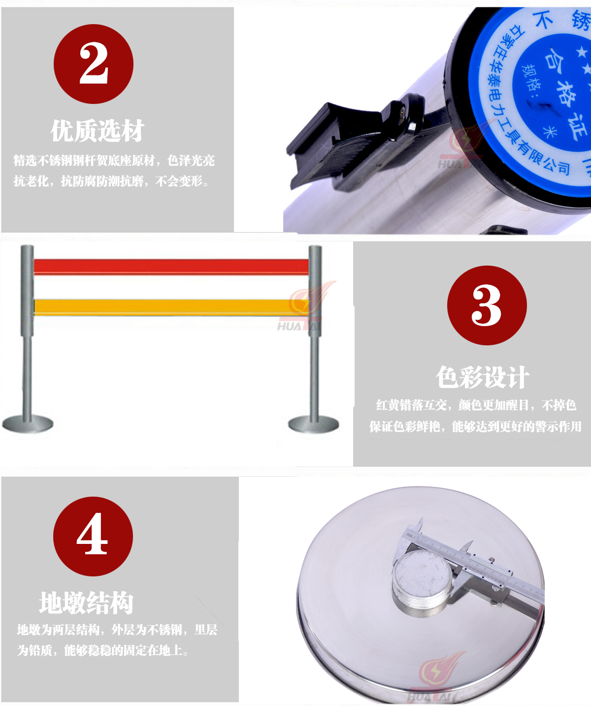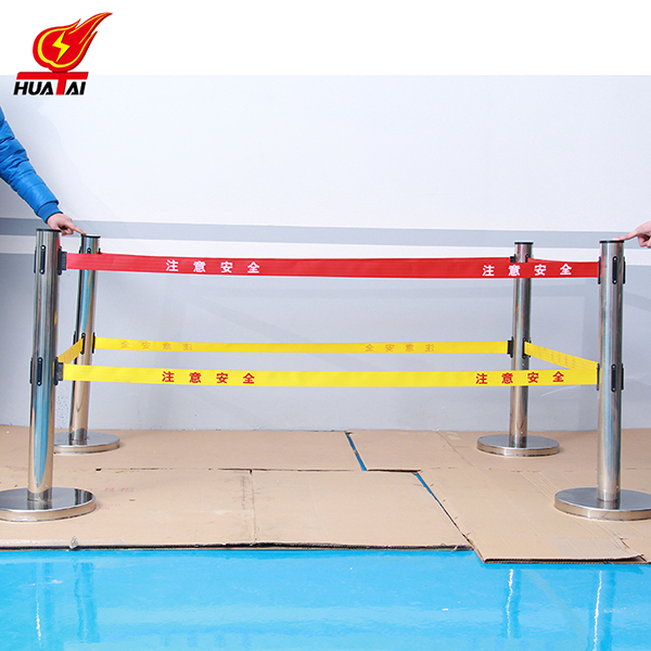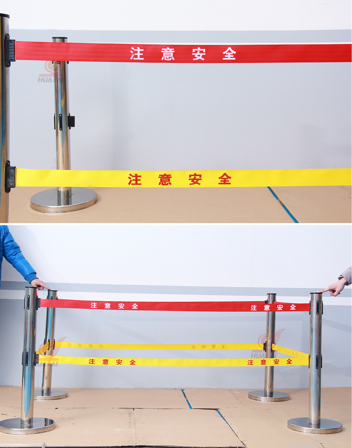 帶式伸縮圍欄 高度1米,筒體的直徑是76mm,筒的壁為0.8個厚,底盤是 350mm。 帶子最長做到5米,帶寬5cm 。可以雙層也可以單層帶子,兩層帶子的間距30厘米,一般是上紅下黃,紅色帶子上印 黃字(白字),黃色帶子上印紅字。這樣比較醒目。字分熒光字和普通字。 “閃電符號 止步 高壓危險/危險/止步 危險” 等等,可以根據客戶要求定做。每根立柱上都含有帶子,四個方向都可以掛帶子。熒光式安全警示帶圍欄,產品設計精美,使用靈活,隨意伸縮,隨意間距,和分割 形狀,無限連接等特點。