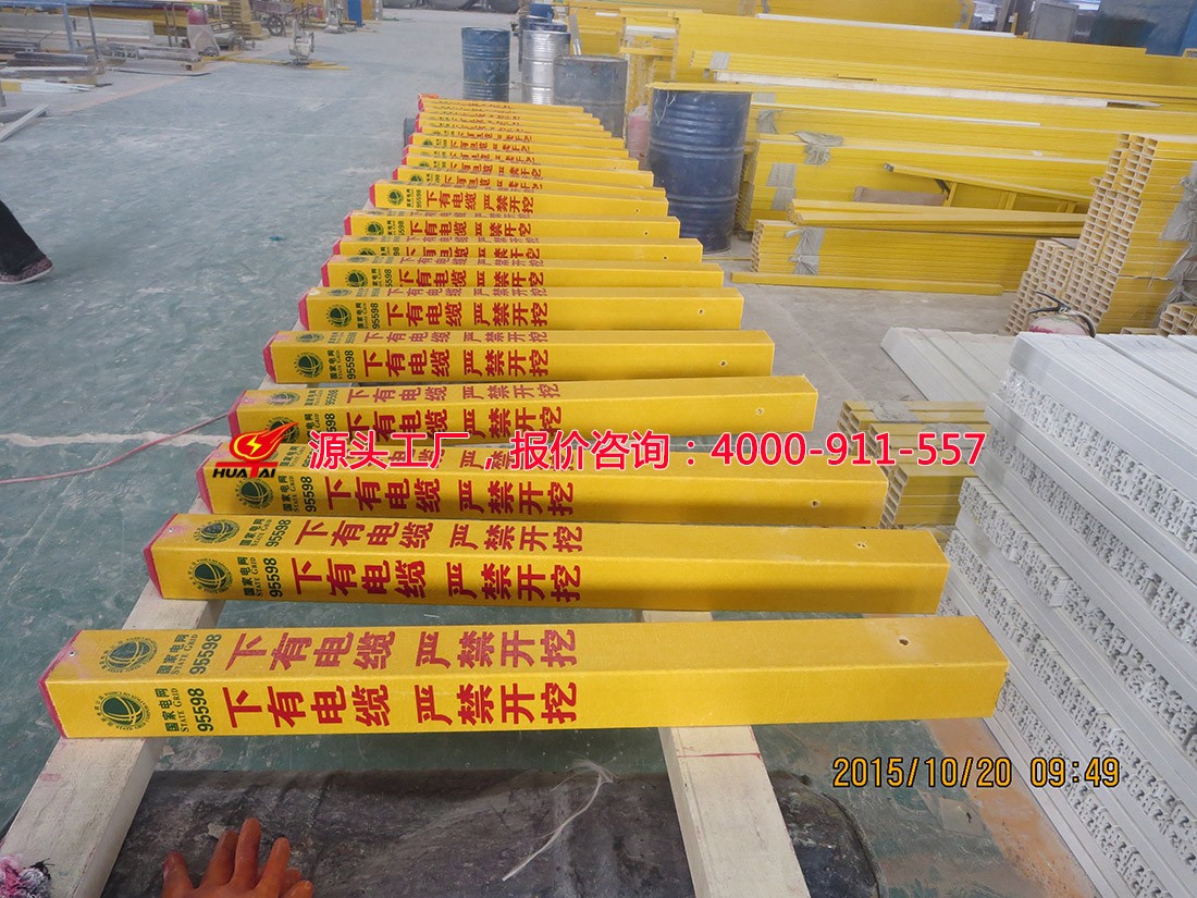 經高溫壓制而成。抗沖擊,耐磨損,耐高溫,耐腐蝕,可以抗水、汽油、酒精、電解鹽、醋酸、鹽酸、鈉鉀化合物、尿、瀝青,適合各種酸堿土壤。使用壽命長達30年。內容采用絲網印刷技術,警示效果好,不需要維護。重量輕,便于運輸安裝。無回收價值,自然防盜。
